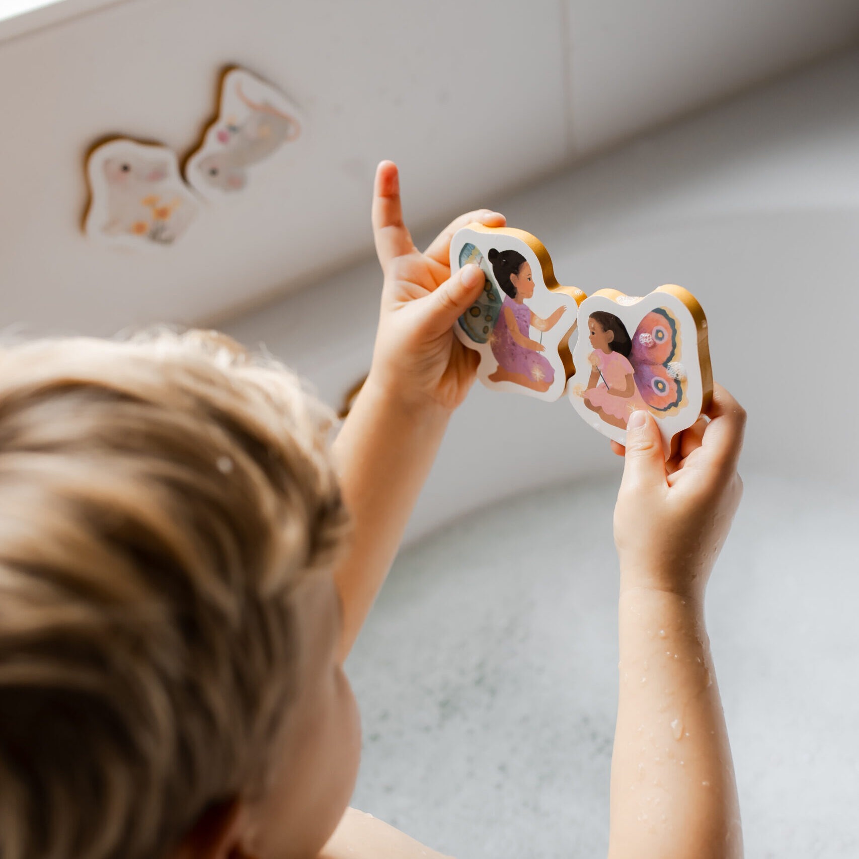 Komplektis on 16 motiivi. Vannimänguasjad tulevad mugavalt kotikeses, kuhu saab need pärast mängimist hoiule panna.